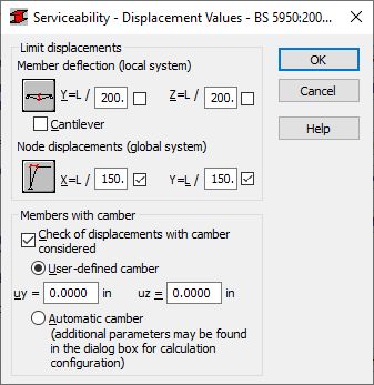 The user may define limit displacements (member deflections in directions X and Y, node displacements in directions X and Y) and additionally, when defining member limit deflections, the user may determine, if the member is a cantilever. In the bottom part of the dialog box parameters of members with camber may be defined: