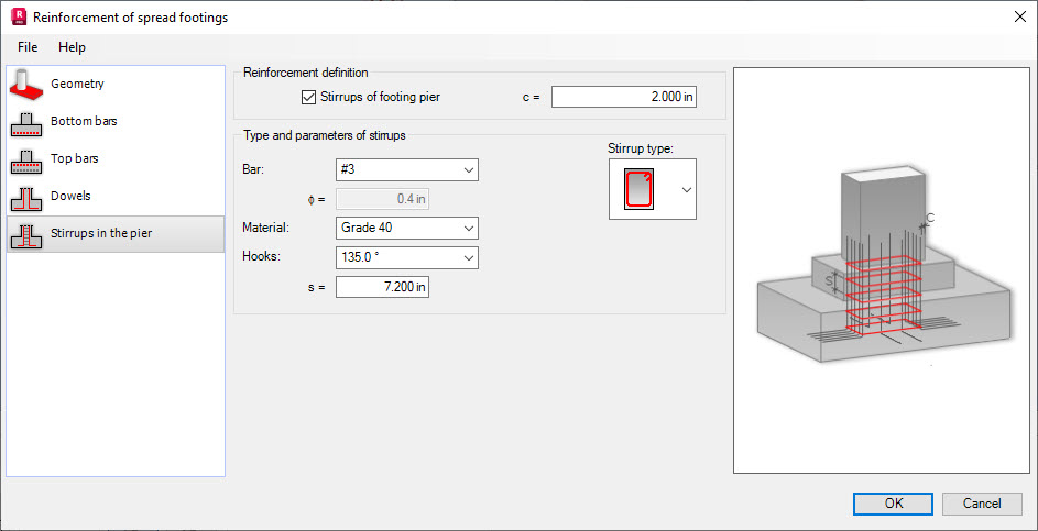 To generate stirrup reinforcement, under Reinforcement definition, select Stirrups of footing pier. You can then define parameters of stirrups: