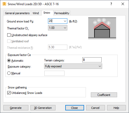 - Automatic - Automatically calculates a snow load based on the specified parameters: terrain category and roof exposure condition.