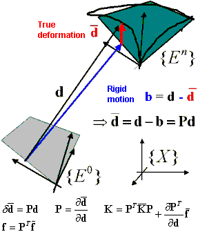 Element processing is performed with respect to the element frame {E} rigidly attached with the displacing element. Afterward, calculated forces and the stiffness matrix are transformed to the global system.