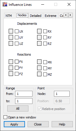 The options in the dialog let you indicate the nodal quantity for which the influence lines are presented: