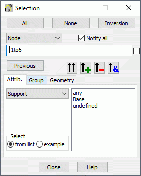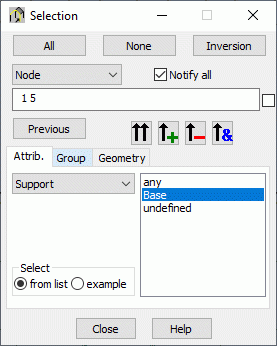 A checkbox for determining the definition of selection mode is found to the right of the list of selected nodes. If deselected, the field of node selection will display node numbers corresponding to the nodes where the support is applied.