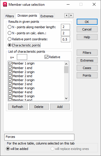 If N points along member length is selected, the number of points (including beginning and end nodes) can be defined and distributed evenly along member length for table presentation. The default value is N=2, so the values of the quantities selected for presentation will be displayed in the table only for the beginning and end of the member. When N=3, a point will be added in the member center (dividing the member into two equal segments) and display it appropriately in the table. The division point can be defined by selecting Relative point coordinate. Define a number belonging to the (0,1) interval, which will define the distance of the point from the member beginning. If the Characteristic points tab is selected, you can define a point along the member length by specifying the relative or absolute distance from the member beginning. Values will be presented in the table.