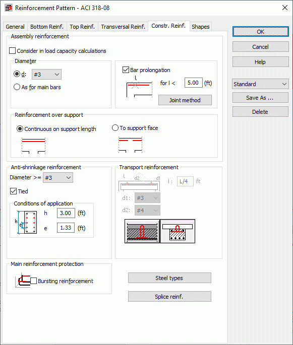 - Steel type as for longitudinal/ transversal reinforcement. This option allows determining a steel type for all structural reinforcement elements except transport reinforcement, for which a steel type is defined separately. If the Consideration of Load Capacity option is switched on for the assembly reinforcement, then there should be set an identical steel type as in case of longitudinal reinforcement. Otherwise, the calculations may be incorrect.