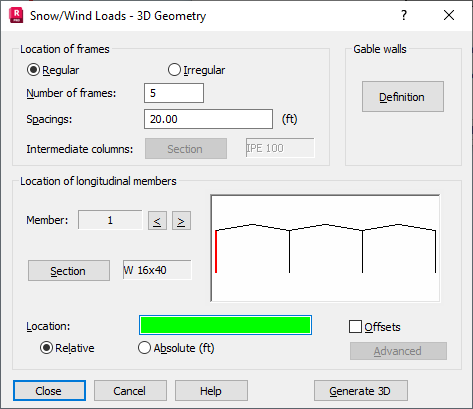 - Snow/wind loads are generated for a previously defined 2D frame.