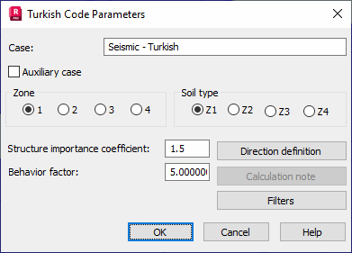 Parameters of a structure seismic analysis depend on a seismic code used during calculations of a structure influenced by seismic loads. Select the seismic Turkish code in the New Case Definition dialog or click Parameters in the Analysis Type dialog.