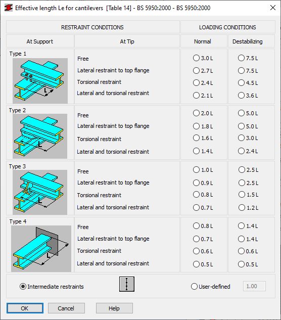 The option is used to determine appropriate distances between member cross-sections protected against torsion, i.e. to determine so-called: effective length - for a cantilever. The option is accessible after pressing one of the buttons: Upper flange or Lower flange provided in the Lateral buckling parameters field of the Member Definition - Parameters dialog box.