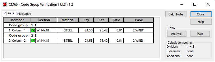 Once calculations have been performed a dialog displays simplified results for the selected type of verification.