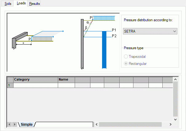 You can define external loads applied to soil on the Loads tab. The loads are defined in the table at the bottom of the dialog. Each load is assigned a name and a list of parameters depending on the load type. You can define the following load types: