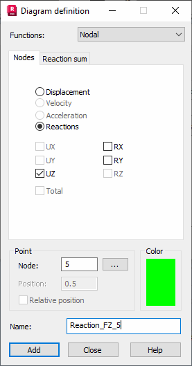 The Diagram definition dialog defines the diagrams of the quantities calculated during advanced analyses (non-linear, time history, and PushOver analyses). The dialog opens after clicking Add or Modify in the Advanced analysis dialog.