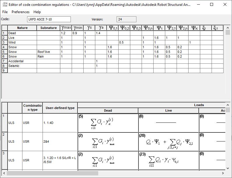 After the factor values or combination formulas of regulations were modified, the edited *.rgl regulation file may be saved by selecting File > Save. The file is saved by default in the user's data folder (...\ Users \ your_login \ AppData \ Roaming \ Autodesk \ Structural \ Common Data \ version_number \...).