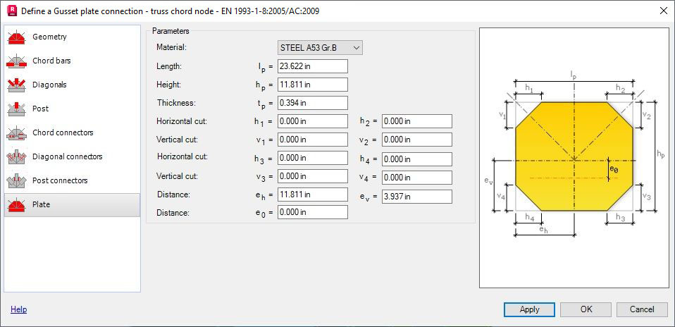 Use the Plate tab to define geometrical parameters of the gusset plate; you can also select a material of the gusset plate on this tab.