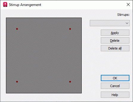 To define a stirrup with the required shape, one should click the successive longitudinal bars with the left mouse button. The operation defines the shape and arrangement of transversal reinforcement. The determined stirrups should have the shapes of closed figures. A pin or shackle is symbolized by a straight segment connecting two longitudinal bars. Pressing the Apply button after every stirrup definition results in accepting the definition of the stirrup shape. Once the shape is defined and changes accepted, the defined stirrup shape is displayed in the figure representing the cross-section of the column.
