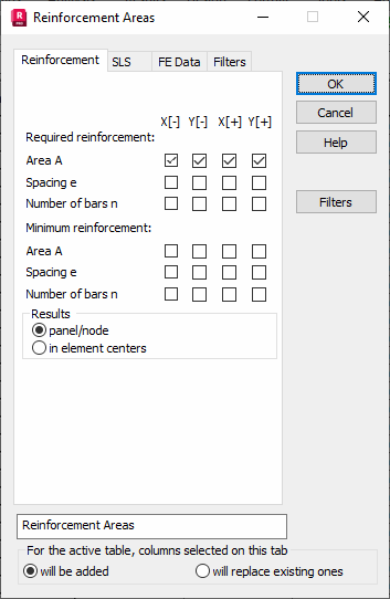 Select the Reinforcement tab in the Reinforcement Areas dialog to select quantities of slab and shell reinforcement for presentation.