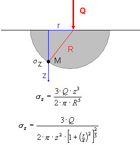 Applying the superposition principle enables calculation of a stress at the point P(0,0,z), resulting from an arbitrary area loaded with a uniform load according to the principle below.