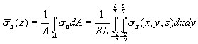 Solutions to the above equations for corner points of the rectangular area, under the center of the rectangular area as well as for an average value under the rectangular area, are given in the literature. To obtain a value of the average stresses under the rectangular area use the following formula. After integration, it assumes the form applied in the calculation algorithm.
