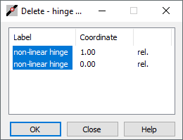 - If more hinges are defined on the bar, the Delete - hinge selection dialog (see the following image) opens. After selecting a hinge in the dialog, the hinge is deleted from the selected bar.