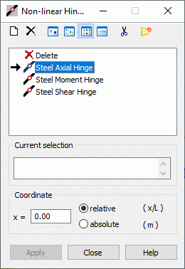 This option is used for defining and assigning non-linear hinges to structure bars. These hinges are used in Pushover analysis for selected structure types in Robot (except for: 2D truss, 3D truss, plane stress structure, plane deformation structure, and axisymmetric structure).