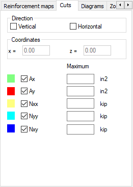 The tab selects the direction of a cut (vertical or horizontal) and a value to be presented on a cut. The values available include Reinforcement in X or Y direction (horizontal and vertical) denoted Ax and Ay as well as internal forces in directions X and Y (horizontal and vertical), and also tangent lines XY denoted Nxx, Nyy and Nxy, respectively.