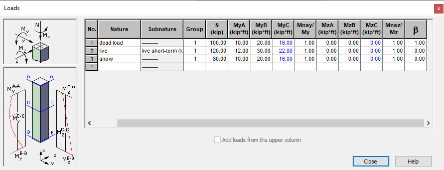 Column loads must be defined in order to activate the calculation options for a column. To run column calculations, each of the defined cases must have at least one non-zero component (N force or one of the moments); additionally - one of the load cases should contain a non-zero load force.