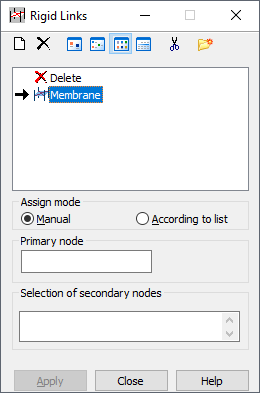 This option defines rigid links in a structure. A rigid link is used to model completely rigid elements of elastic structures (definition of a rigid body in a structure). Displacements and rotations defined for a rigid link can be limited to certain selected degrees of freedom.