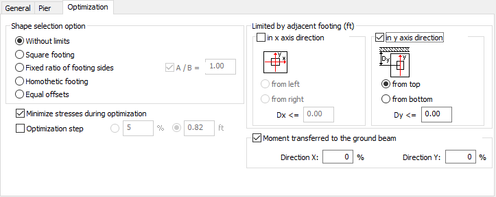 The Optimization tab allows you to define the shape and dimensions of a designed foundation.