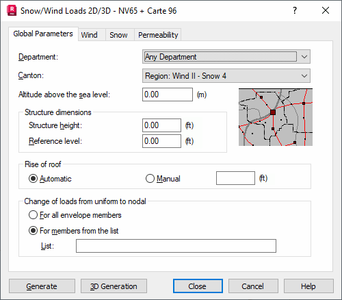 Opening the Snow/Wind Load dialog and clicking the Global Parameters tab displays the following dialog.