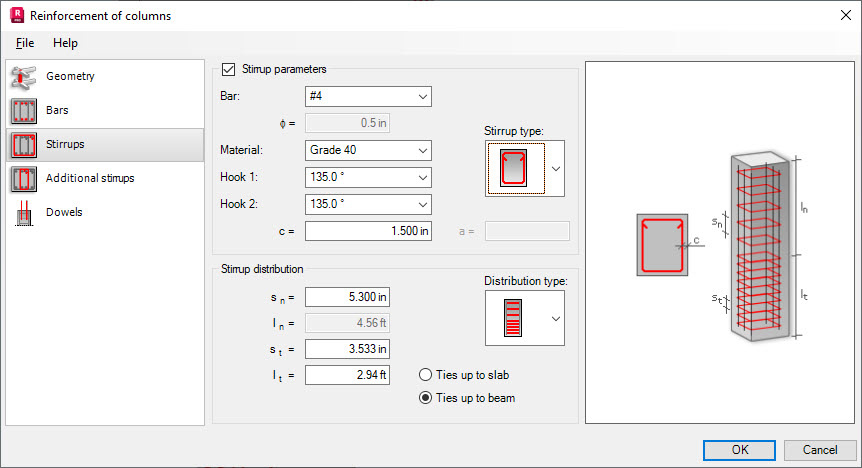There are several parameters of transversal reinforcement (stirrups) defined in the Reinforcement of columns dialog: