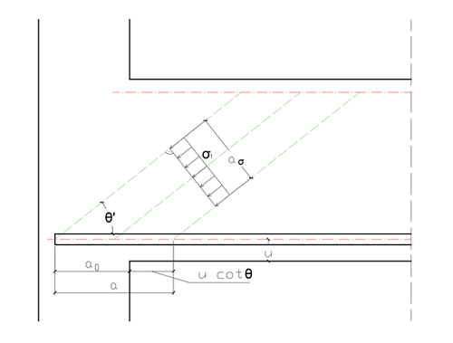 The angle of the new compression strut is marked as θ' and its maximum dimension is determined by the distance between points D and E.