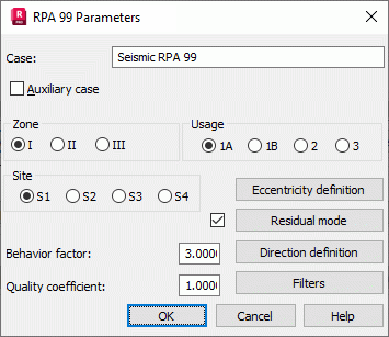 Parameters of a structure seismic analysis depend on a seismic code used during calculations of a structure influenced by seismic impact. Select Algerian seismic code RPA 99 or RPA 99 (2003) in the New Case Definition dialog or click Parameters in the Analysis Type dialog.