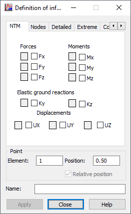 A function is defined after selecting only 1 result quantity on any of the tabs and selecting an element or node. For bar structures, the Position field is also available, which lets you determine a relative coordinate on a bar for which results are saved. For surface elements, the values of forces and stresses are read at element centers.