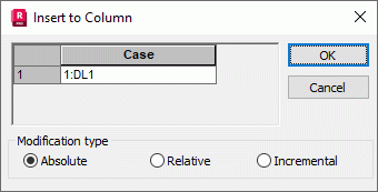 For example, the available load cases include numbers 1, 3, 5, 6, 7. The cases 5, 6, and 7 should be changed to 2, 3, and 4. To do so, select the records 5, 6, and 7 in the Case column. Right click and select Fill Special. Select the modification type (Absolute) and enter 2. Cases 5, 6, and 7 change to 2,3, and 4. Case 3 will be assigned the first free number outside the block.