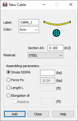 When selected, it defines the normal stress, calculated with respect to the cable chord, for an assembling case load. Enter the value of the stress in the appropriate field.