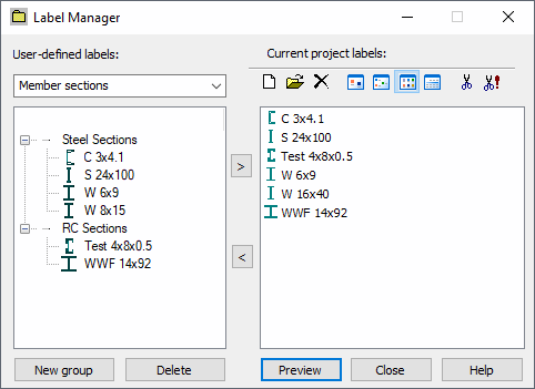 The Label Manager stores a library of labels for structure elements, such as, supports, releases, sections, and code parameters. In this library, you can save a user-defined label so you can use it in other structure projects.