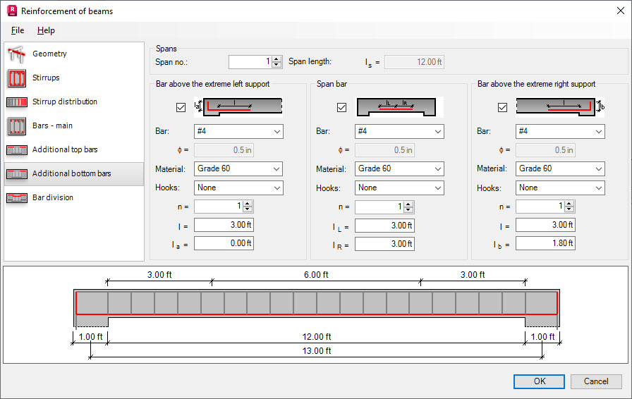 These reinforcing bars are generated separately for each beam span. Parameters of these additional bottom bars include: