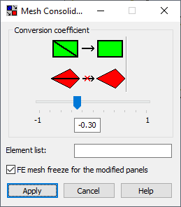 If you use +1 as a coefficient, rectangles are created from triangles in all possible places within the indicated area. This, however, can generate rectangles with incorrect shapes resulting in the ill-conditioning of a set of equations. If you use -1 as the coefficient, only those triangular elements that form a rectangle are changed.