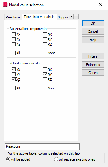 Select the Time history analysis tab in the Columns dialog for the presentation of nodal quantities.