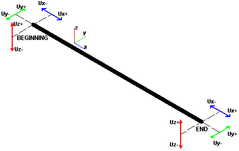 - (Ux, Uy or Uz) "+" or "-" - Specifies release displacements Ux, Uy, or Uz in the beginning or in the end node of the member element, in the compatible ("+") or opposite ("-") direction with respect to the axis of the member's local coordinate system. The following image shows possible directions of releases.