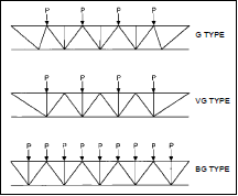 There are three main types of point load distribution for joist girders: G, VG, and BG, as shown in the following figure.