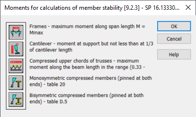 The options included in this dialog enable defining schemas of bending moment distribution along the length of an analyzed element. This information is applied in stability verification of elements subjected to simultaneous action of compressive force and bending moments (see point 9.2.3, Table 20 and Annex D).