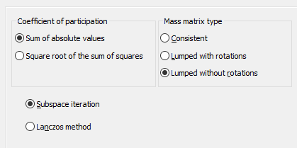 Note: You cannot use Lanczos' method for structures that are separated (Lanczos' method requires a lumped T tridiagonal matrix, while a separated structure - a consistent T matrix). To use Lanczos' method, you must connect structures that are separated in such as way as not to change the structure model. For example, you can add a bar among the supports. If Lanczos' method is selected, calculations are performed using the subspace iteration method.