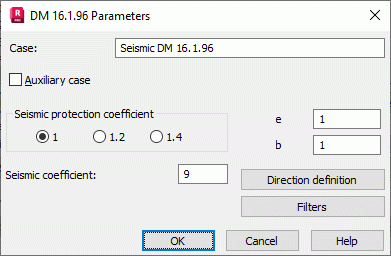 Parameters of a structure seismic analysis depend on a seismic code used during calculations of a structure influenced by seismic impact. Select Italian seismic code DM 16.1.96 in the New Case Definition dialog or click Parameters in the Analysis Type dialog.