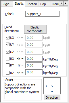 For an elastic support, specify either the blocked degrees of freedom or the coefficients of elasticity in the appropriate directions: