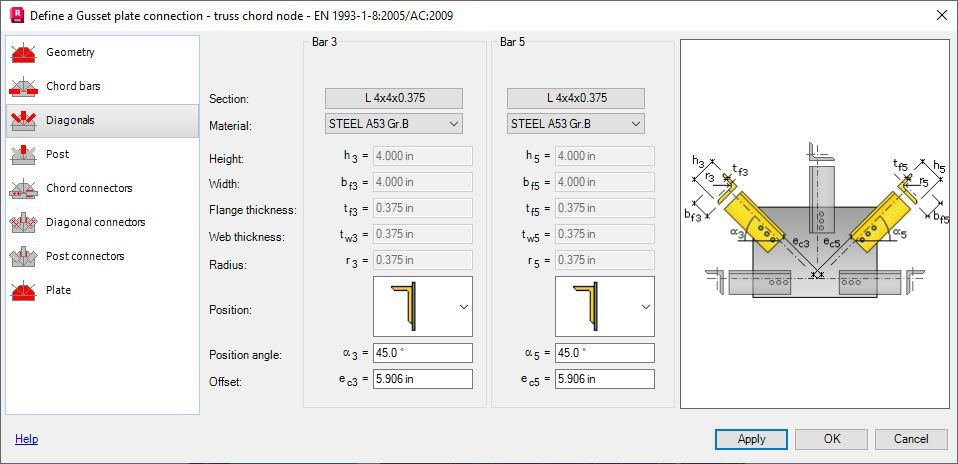 Use the Diagonals tab to define basic parameters of diagonals that adjoin the gusset plate. They include: