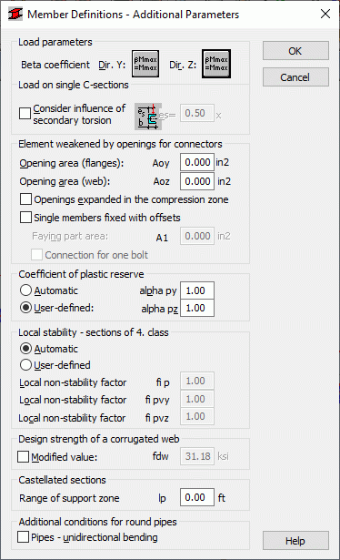 Additionally, in the case of Polish code PN-90/B-03200, you define Beta coefficient and the plastic reserve coefficient Alpha. When applying the Polish steel code during calculations, for members made of sections with corrugated webs, the web capacity is automatically reduced by 20 MPa with respect to the strength of flanges (this assumption is adopted in the technical documentation). You can also manually define the value of the web strength to force the strength of a corrugated web. In the Design strength of a corrugated web field (options for Polish steel code PN-90/B-03200) select the Modified value fdw option, next in the edit field - and specify the strength value used in calculations.