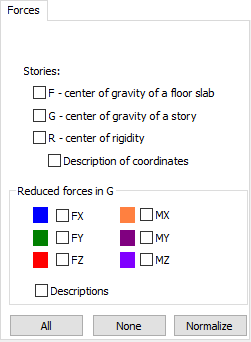 In this dialog, reduced forces (FX, FY, FZ, MX, MY, MZ) may be selected for presentation; these forces and moments are reduced to the center of gravity on each story for a given case. For each of the values above, the appropriate color and description (values of forces) can be selected.