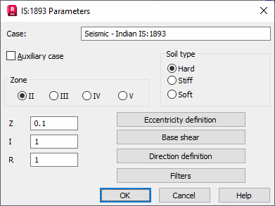 Parameters of a structure seismic analysis depend on a seismic code used during calculations of a structure influenced by seismic impact. Select Indian seismic code (IS 1893) in the New Case Definition dialog or click Parameters in the Analysis Type dialog.