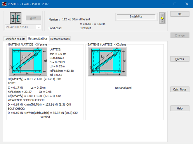 After the verification of a complex member you can select and verify elements connecting individual member chords. Analysis of chord connections in a complex member is run by clicking the Lattice button in the RESULTS - Code dialog. The Connection of Chords dialog consists of two tabs containing data about connectors in planes XY and XZ needed for calculations. For each of the planes the analysis is carried out independently.