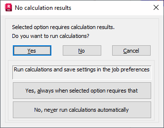 - Select how the program prompts you when an option that requires results is called up and prior calculations have not been run.