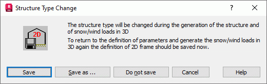 Note: Robot requires a project to be saved when a structure type has changed. Therefore, if a 2D frame has not been given a name yet, Robot opens the Save as dialog. A 3D structure is saved without the 3D loads.